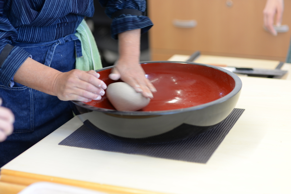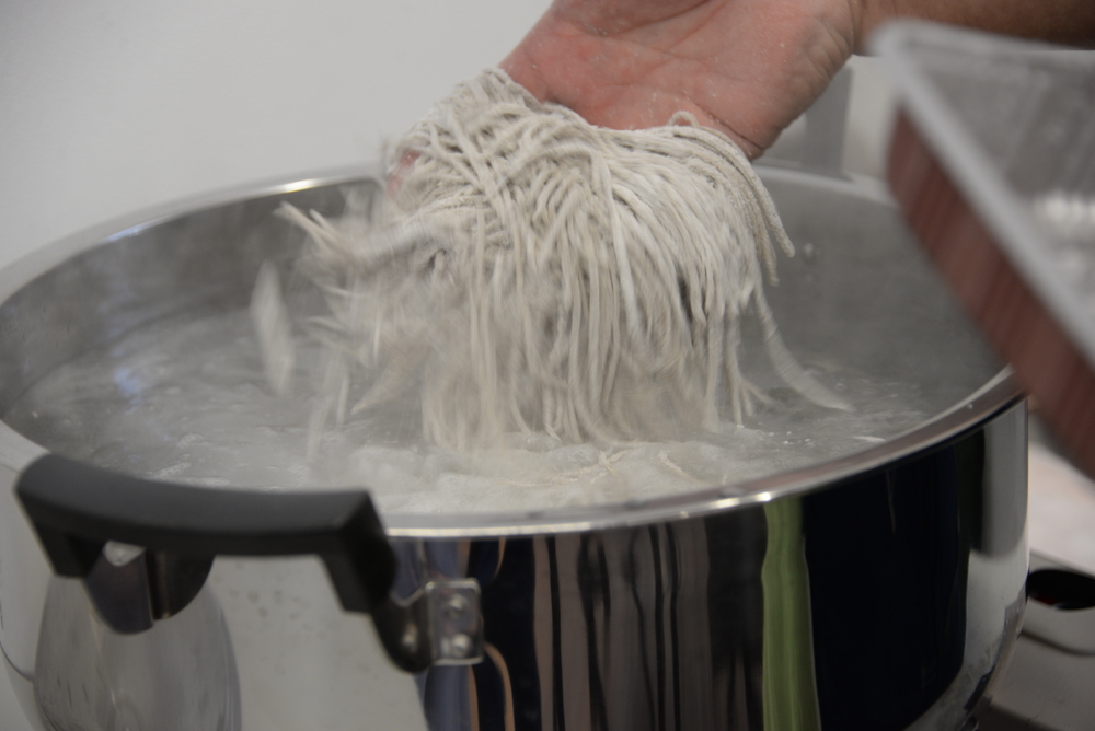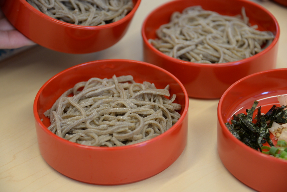 - 麺を茹でて洗い、冷水で締めて「割子」で味見する(出来立てを食べてみましょう!)