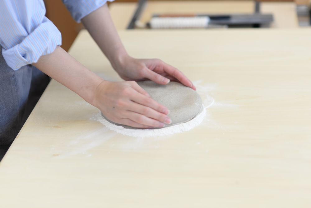 - 「延し」手のひらと麺棒で生地を延ばす 最初は丸く 次に四角く 最後に厚さを整えてたたむ